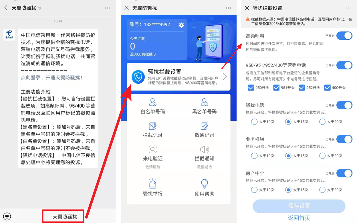 1.关注微信公众号:天翼防骚扰